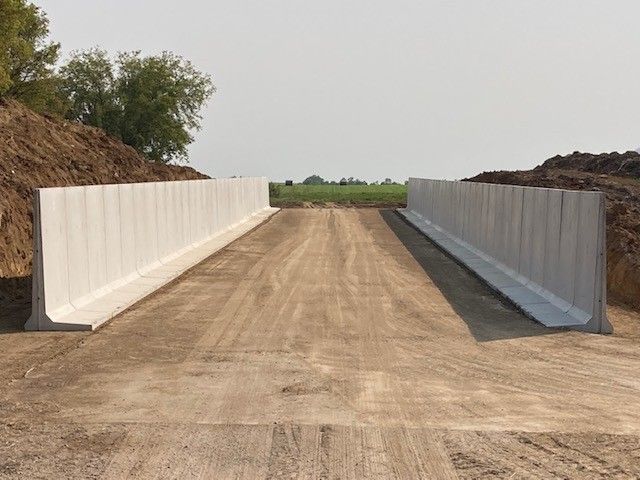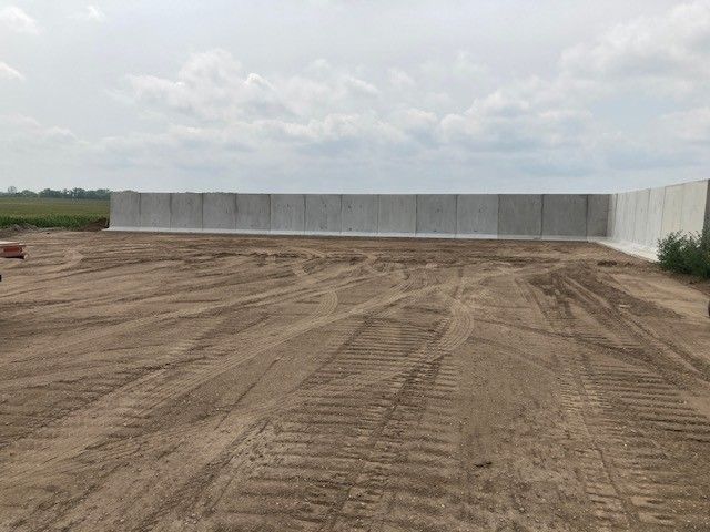 We recommend an 8″ compacted gravel base under our walls; this could vary according to soil conditions. The concrete or blacktop floor is poured up to the base of the panels after the walls are installed. The bunker silos can also be set on your existing concrete or blacktop pad. The precast concrete bunker silo walls are designed to be freestanding, (they don’t need any outside supports). They are also designed to take earth pressure from the outside so they can be installed into a hillside.